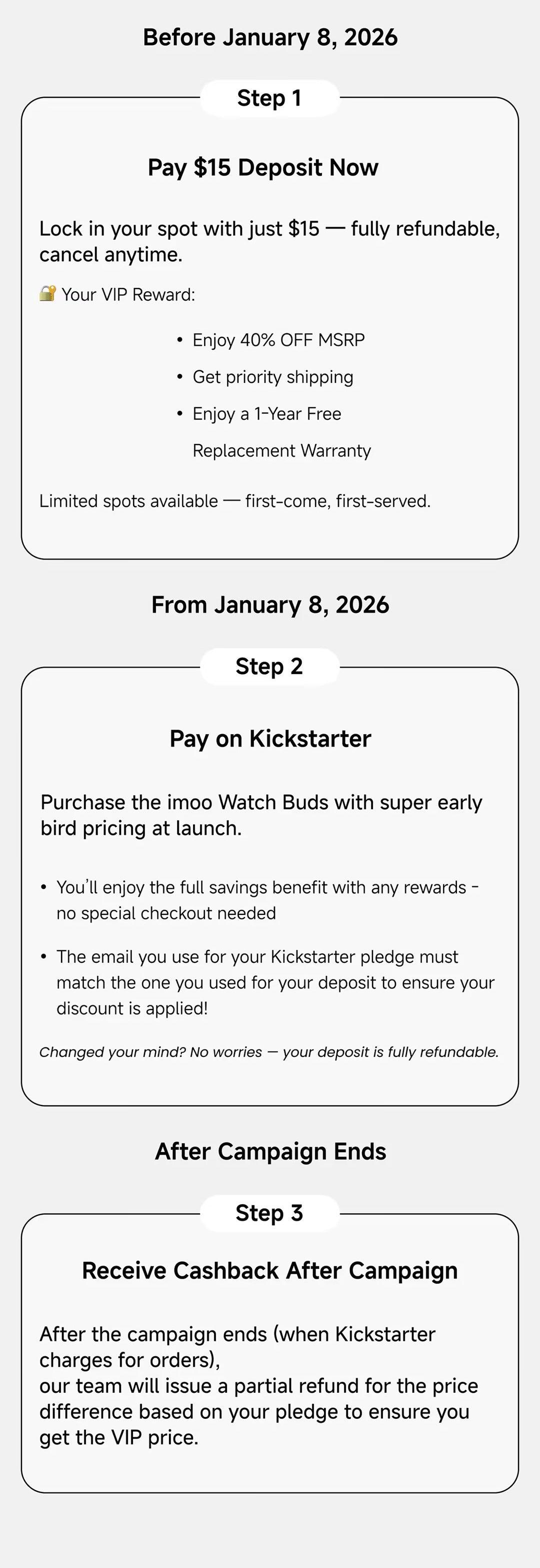 After you complete your Kickstarter pledge using the same email as your deposit, we'll issue a partial refund after the campaign ends. This refund will include your $15 deposit and the extra savings from your VIP Discount (up to 40% off MSRP). No special links or codes needed — just back the campaign and enjoy the full VIP benefit, hassle-free.