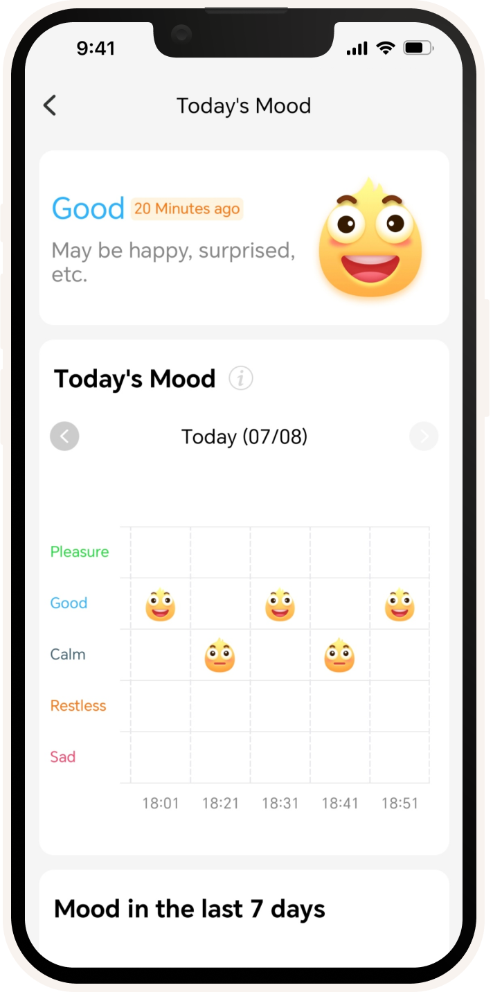 Create deep learning network models based on the user's physiological conditions, changes in heart rhythms, etc. Read your kid's emotions all day long and record their emotional changes throughout the week to help you better understand your kid.