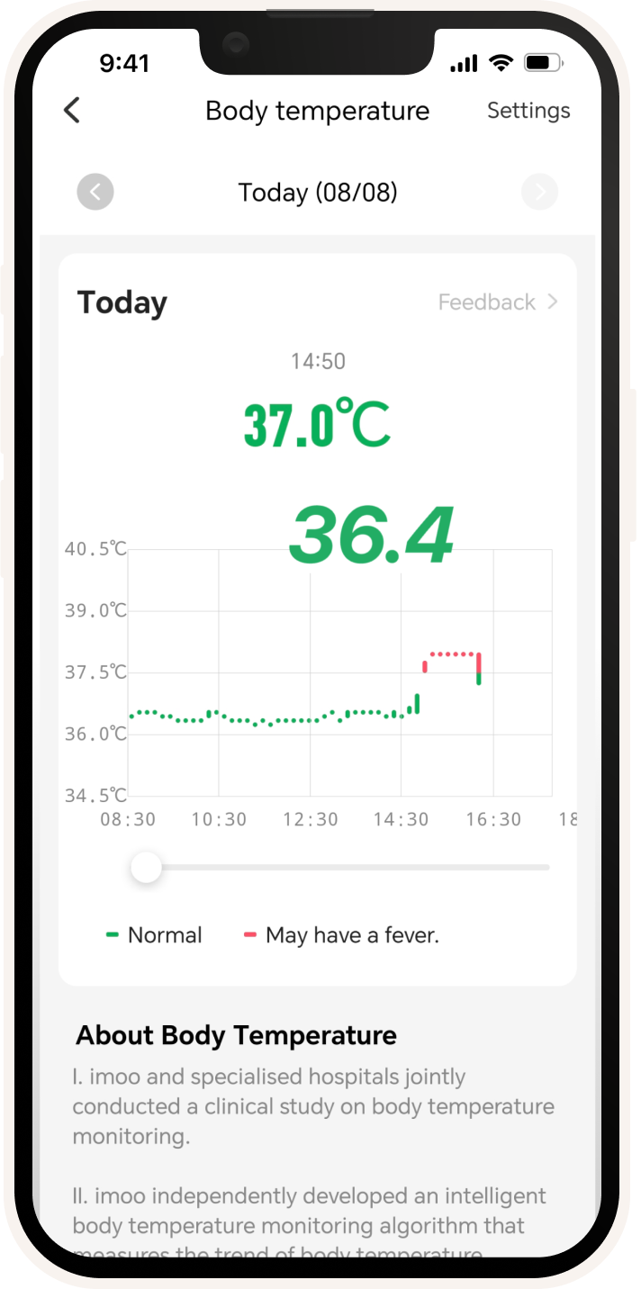 Clinical physiological data & AI model are used for 24-hour body temperature tracking and an alert is sent when signs of fever are detected based on analysis of your kid's temperature changes.